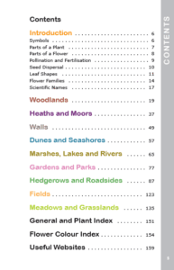 This is a bright and cheerful photographic identification guide aimed at youngsters to help them discover wild flowers when out and about. It has a detailed introduction, i.e. description of parts of a flower and a plant, pollination and dispersal (see below).