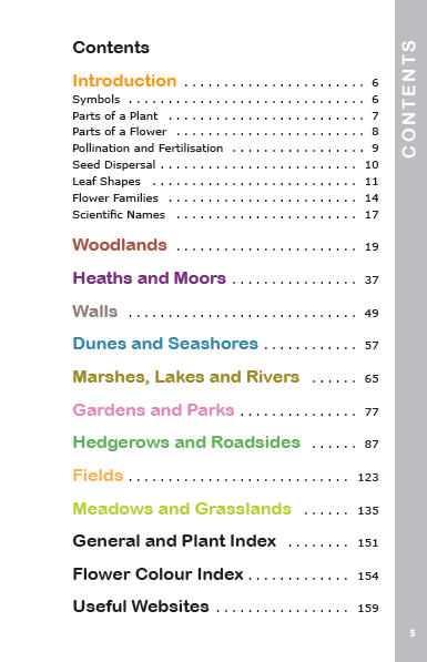 It is packed with facts and details of well over 100 of the most common plants, such as their flowers, fruits, seeds and leaves, as well as their height and flowering season and much more. The clear colour photos and snappy symbols will help you to identify them more easily. For a first look you may want to use the Flower Colour Index.
