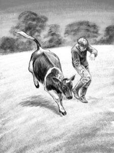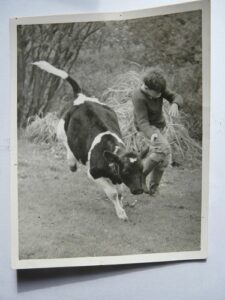 Getting ready to finalise the cover for Bringing home the Cows by Bill Symondson. Bill sent us the original photo of him battling with the calf, to the first design by artist Chris Wormell and the colour image coverdesign by Tanya Warren.
